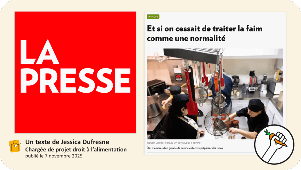 Le journal La Presse a publié, le 7 novembre 2025, une lettre d’opinion percutante de Jessica Dufresne, chargée de projet droit à l’alimentation. Dans sa lettre, elle nous invite à repenser notre rapport collectif à la faim et à la pauvreté. Elle affirme avec justesse et lucidité que l’accès à une alimentation digne est un droit fondamental, et non un privilège.