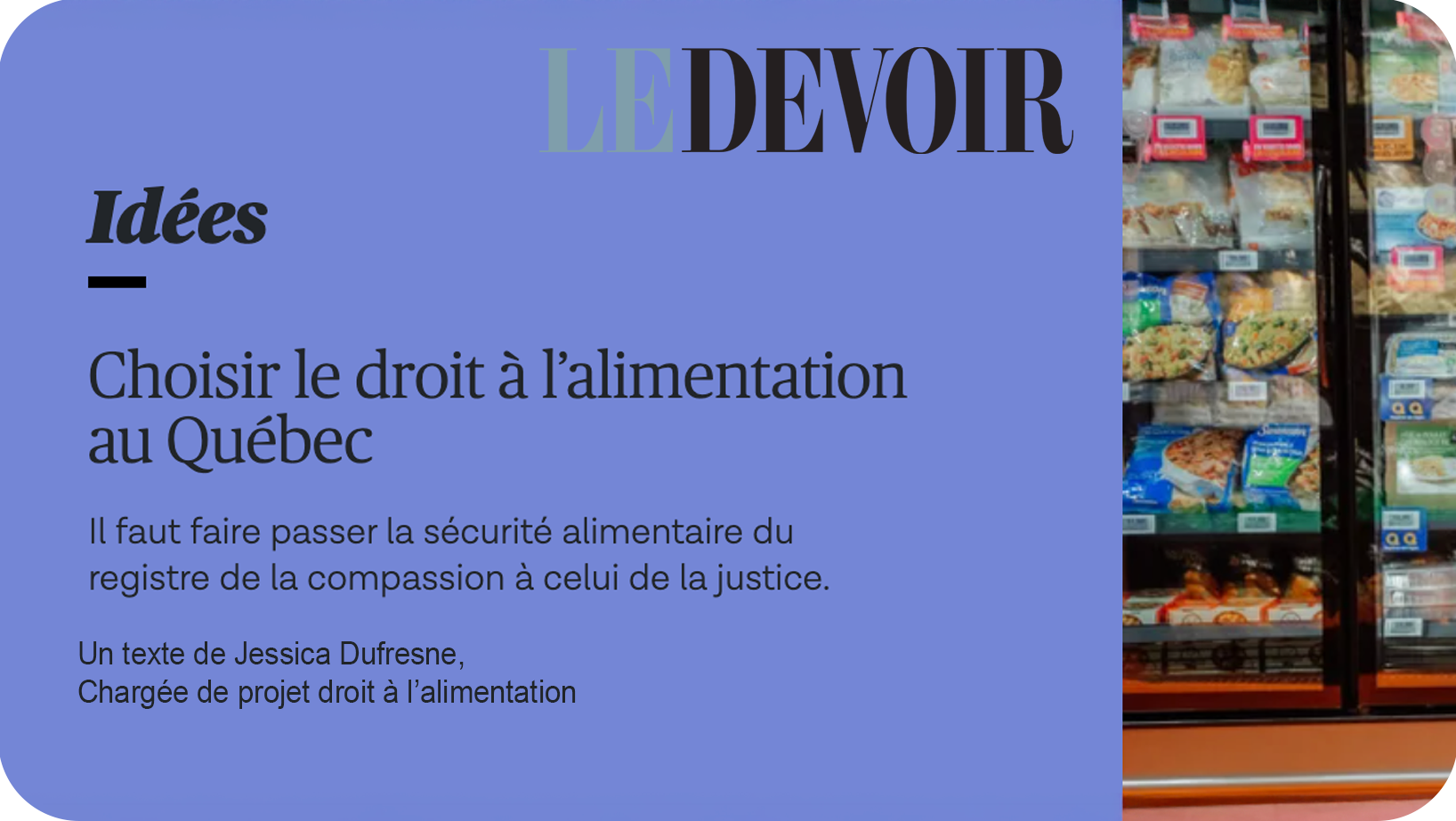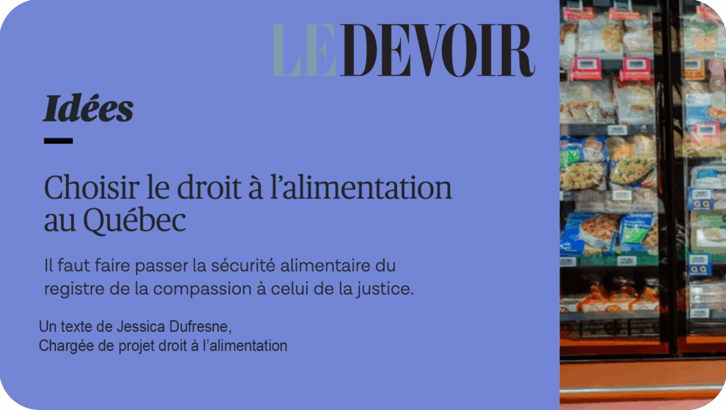 À cette occasion, nous vous invitons à lire l’excellent texte de Jessica Dufresne, chargée de projet Droit à l’alimentation, publié dans Le Devoir. Elle y rappelle avec force et clarté pourquoi ce droit humain fondamental doit être reconnu, protégé par une loi-cadre et mis en œuvre concrètement.